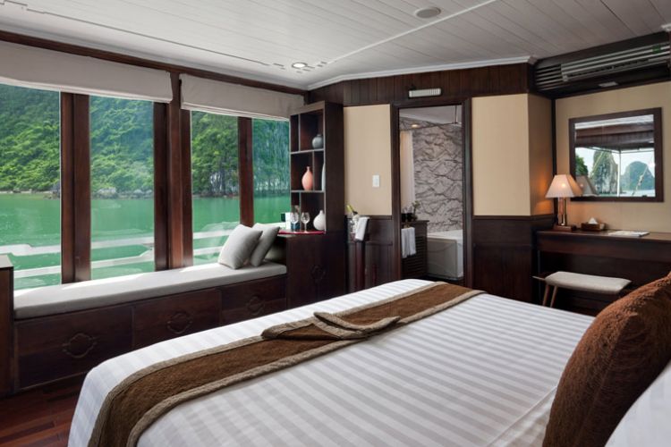 Attend the Cooking class on sundeck – How to make Vietnamese spring rolls - traditional Vietnamese food. Then enjoy Happy Hour (Buy one drink-get one free). It is time for chit chat and relaxing. Watch the magnificent sunset over Halong Bay.