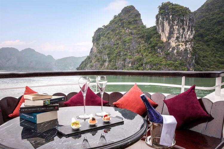 [13:00 - 14:15] Savor your buffet lunch while President Cruises makes its way to Halong Bay, passing the famous Fighting Cocks Islet, Thien Cung and Dau Go Cave.