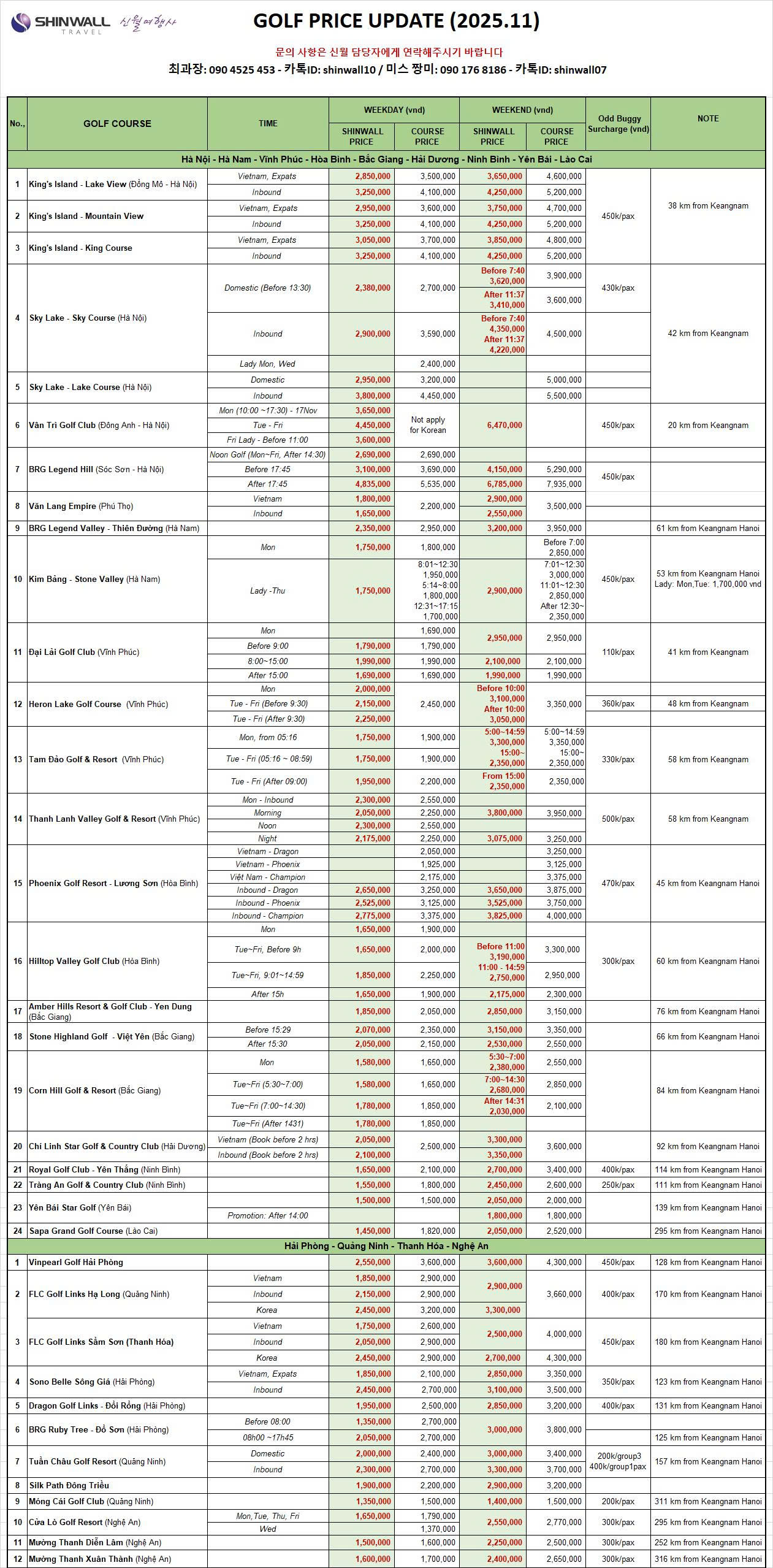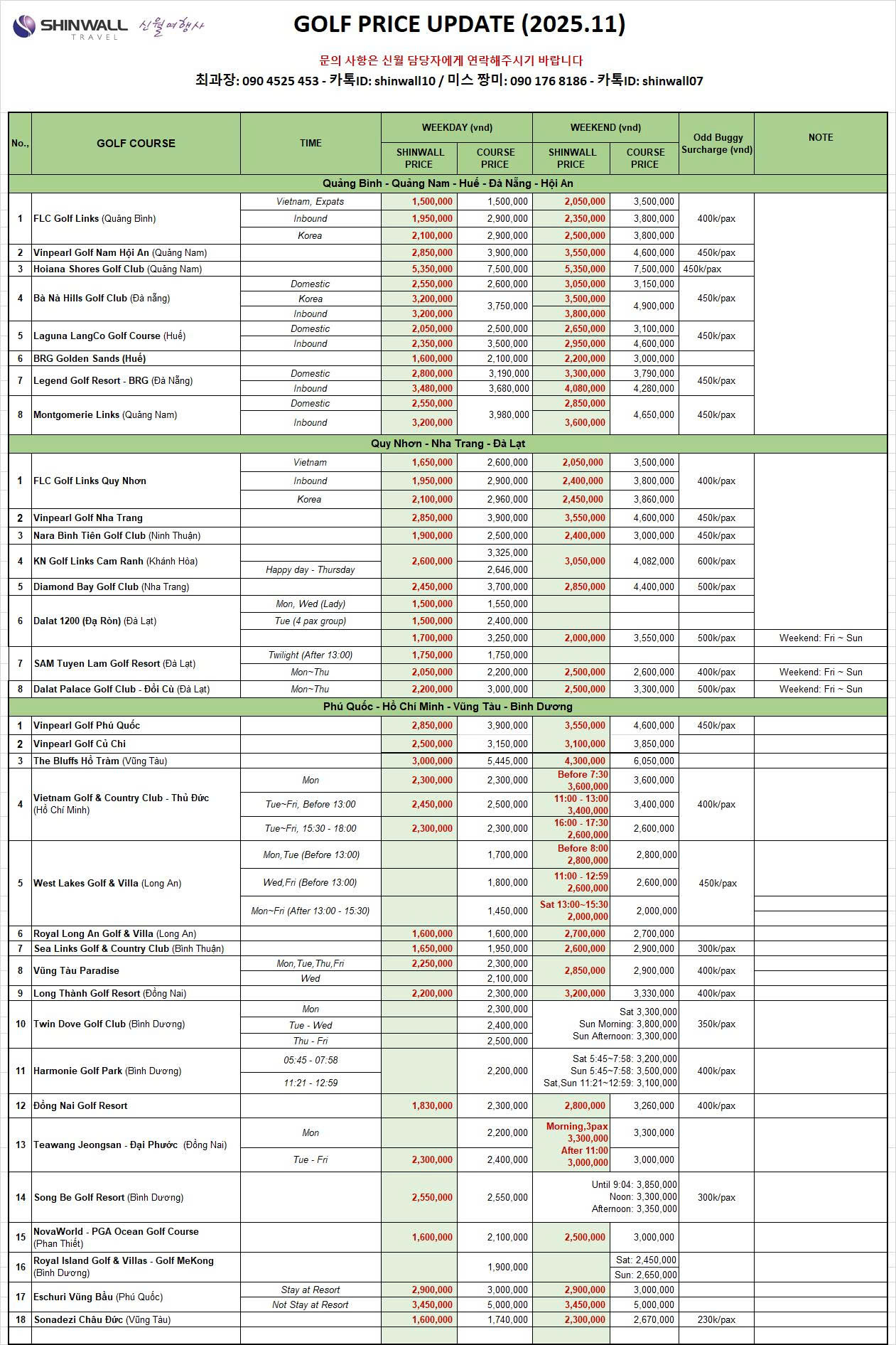 신월은 고객님들께 베트남 전 지역의 모든 골프장의 가격표를 아래와 같이 보내드리고자 합니다. 골프서비스 예약을 원하시면 신월여행사로 연락해주시기 바랍니다.